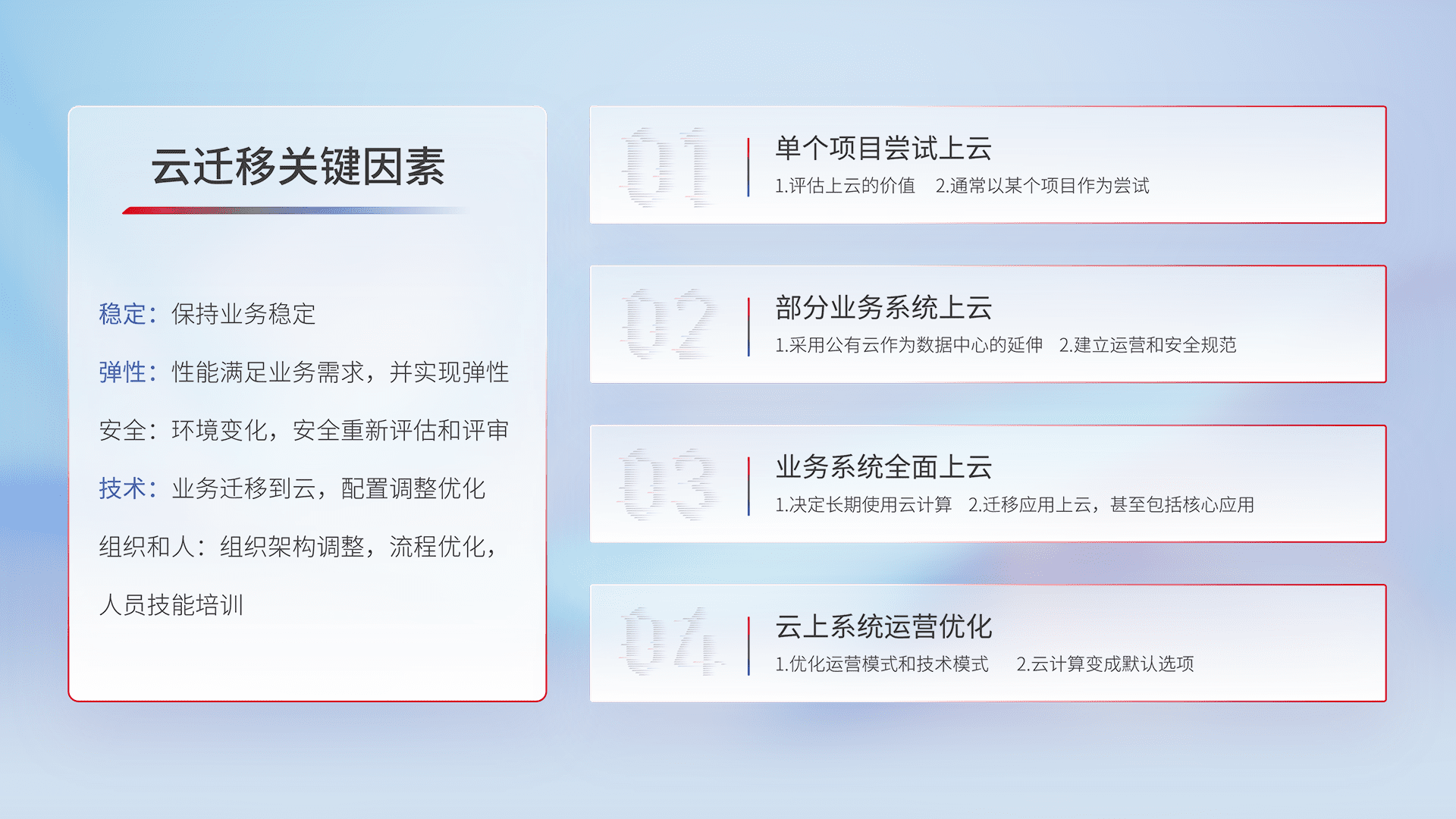 结合实际业务,,,从规划设计、、、、云平台选型、、云原生改造、、、数据迁移、、集成交付,,迁移全过程为客户识别最佳上云路径,,,做好风险识别管理,,,,设计网络架构、、、身份权限、、、安全审计合规、、操作审计、、、、日志审计、、、监控告警策略、、、、多站点容灾设计等,,对云上基础设施进行整体规划,,,,提升IT治理水平,,,,以满足弹性、、高可用、、、高性能的需求。。
